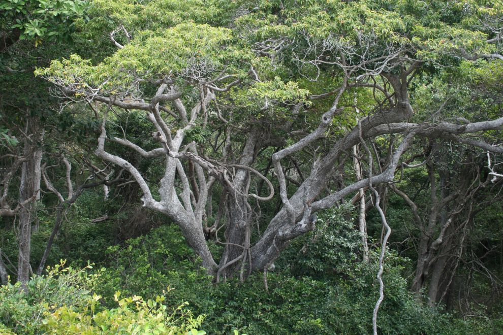 Mabi forest only occurs on fertile, young stony basalt located at the lower rainfall limit of rainforest distribution in the region. It is typified by a high proportion of deciduous and semi-deciduous canopy trees (which exhibit heavy leaf fall in times of moisture stress), along with a dense, well-developed understorey shrub layer.